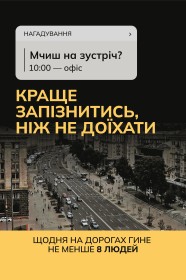 Саме тому ГО «Центр демократії та верховенства права» запускає всеукраїнську інформаційну кампанію «Краще запізнитись, ніж не доїхати», покликану привернути увагу до критичної проблеми швидкості на дорогах. Кампанія нагадує: дотримання встановлених обмежень — це не формальність, а реальний спосіб зменшити кількість аварій, смертей і травм.