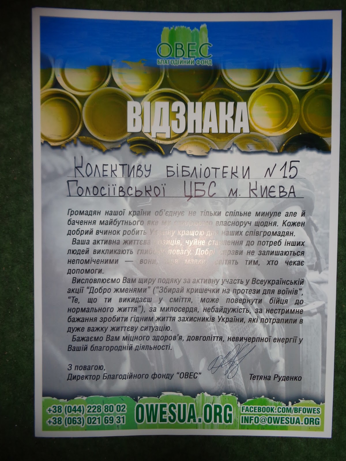 БО БФ ОВЕС запровадив всеукраїнську акцію зі збору та переробки пластикових пляшок та окремо кришочок-закруток для протезування воїнів АТО.