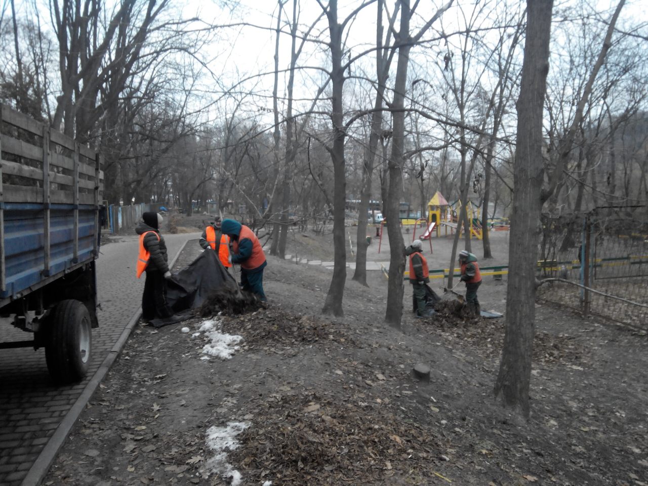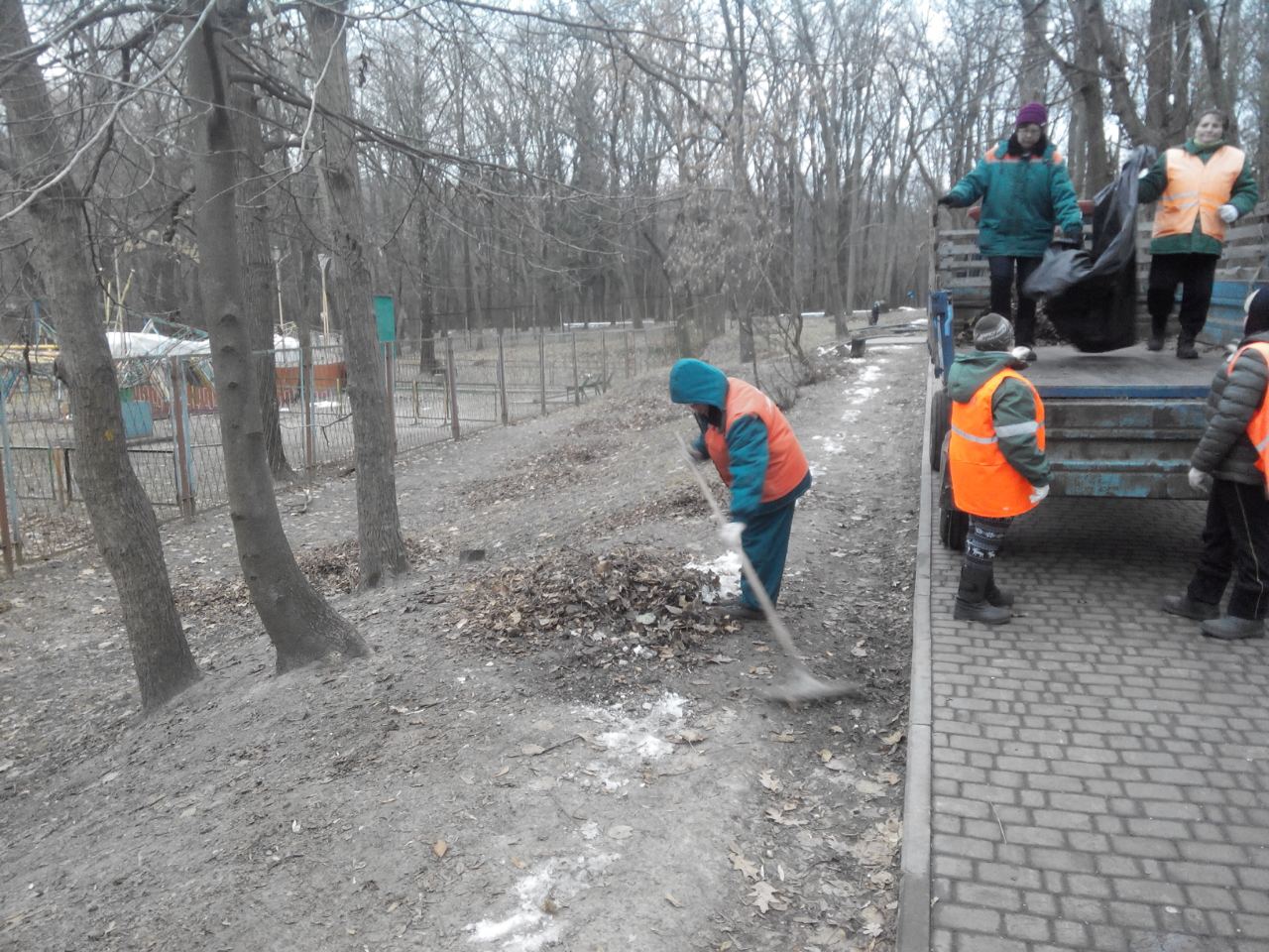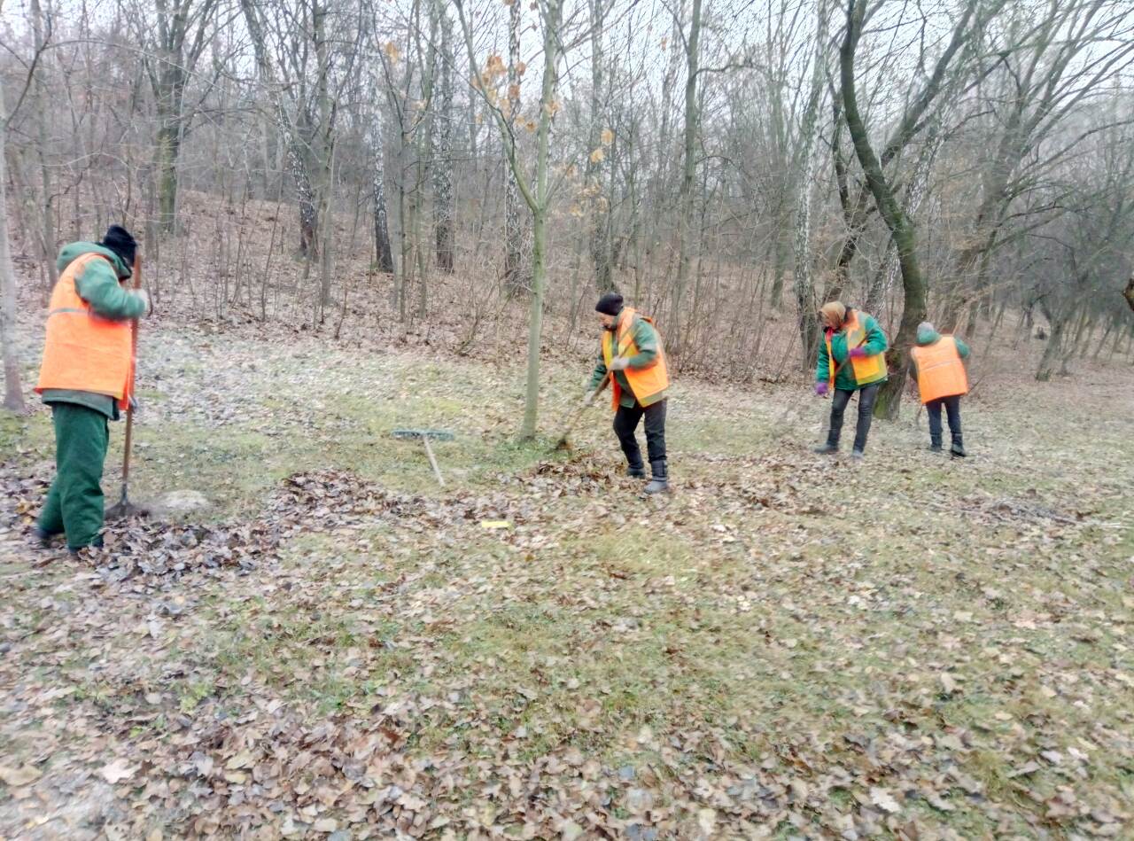 Працівники КП УЗН Голосіївського району щоденно дбають про чистоту та комфорт балансових територій підприємства. Зокрема, на фото показано вигрібання та вивезення опалого листя в Голосіївському парку культури та відпочинку ім. М.Рильського.