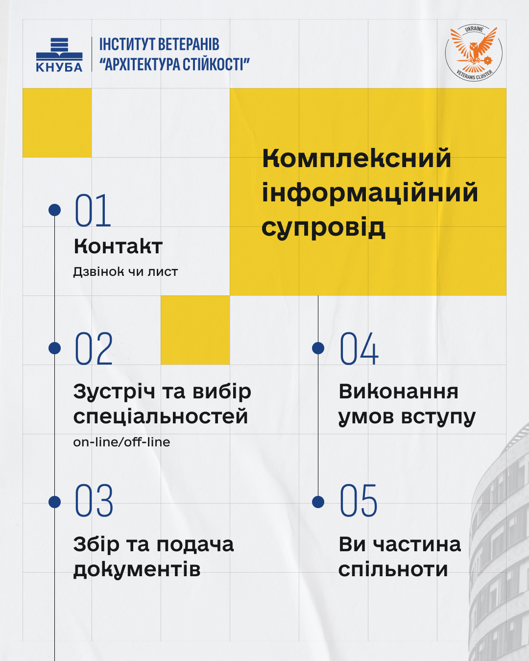 Інститут ветеранів «Архітектура Стійкості» при Київському національному університеті будівництва і архітектури (КНУБА) відкриває доступ до сучасної освіти, підтримки та нових перспектив для ветеранів, захисників та їхніх дітей.