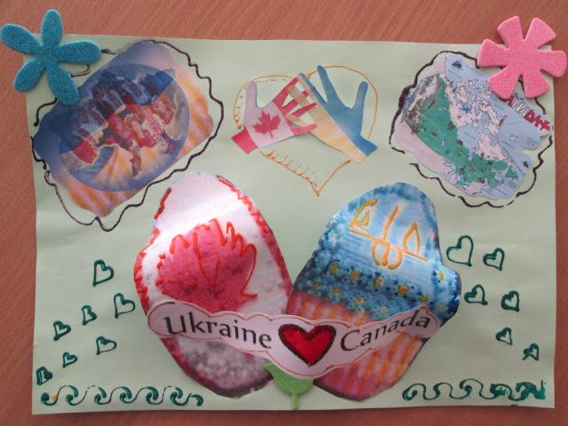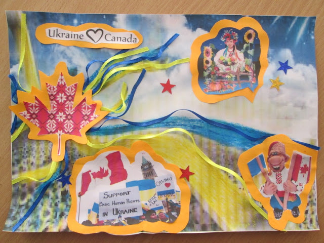 Можливо використовувати фарби, будь - які вирізки з газет та журналів та написи двома мовами: англійською та українською, а також зобразити національну символіку обох країн.