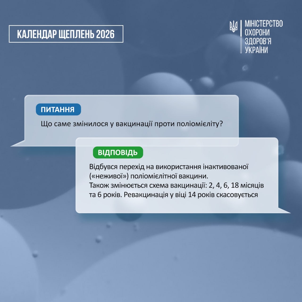 Основною зміною є повна відмова від оральної поліомієлітної вакцини (ОПВ) та перехід на використання лише «неживої» інактивованої вакцини. Також оновлено схему щеплень: відтепер вакцинація проти поліомієліту передбачає п’ять доз, які вводяться у віці 2, 4, 6 та 18 місяців, а також у 6 років. Ревакцинацію у 14 років скасовано.
