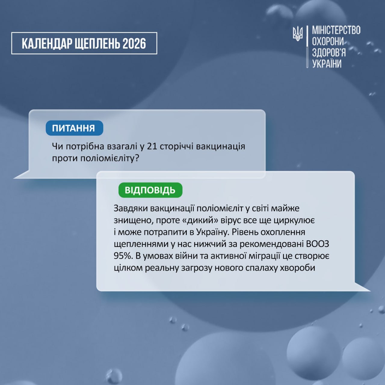 Експерти наголошують: світ наблизився до повної ліквідації поліомієліту. Навіть в умовах повномасштабної війни Україна продовжує виконання Календаря профілактичних щеплень та вдосконалює підходи до імунопрофілактики за підтримки міжнародних партнерів. Саме послідовна вакцинація залишається ключовим інструментом захисту дітей та суспільства від небезпечного захворювання.