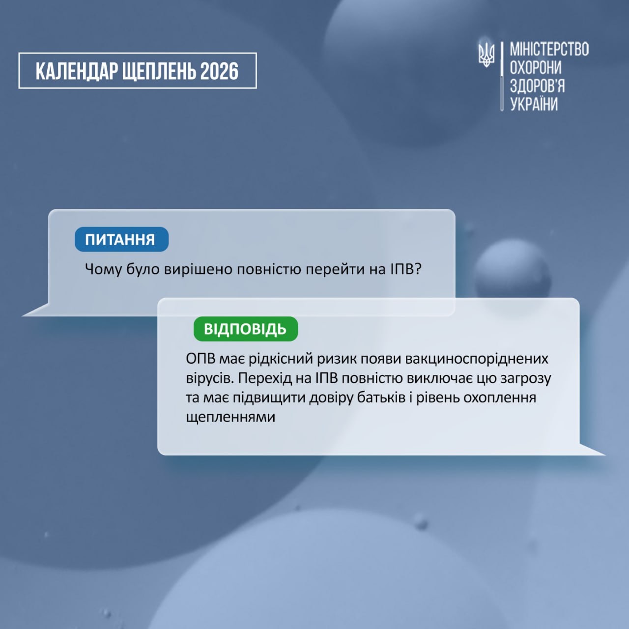 Попри ефективність ОПВ, її застосування пов’язане з рідкісними, але можливими ризиками виникнення вакциноспоріднених поліовірусів, особливо за низького рівня охоплення щепленнями. Крім того, оральна вакцина не забезпечує захисту від поліовірусу другого типу. Перехід на ІПВ дозволяє мінімізувати ризики, забезпечити захист від усіх трьох типів вірусу та підвищити довіру батьків до вакцинації, що сприятиме зростанню рівня імунізації.