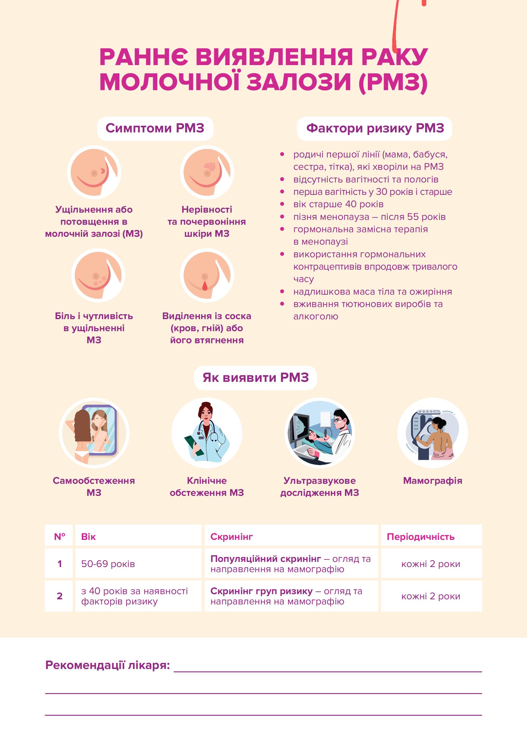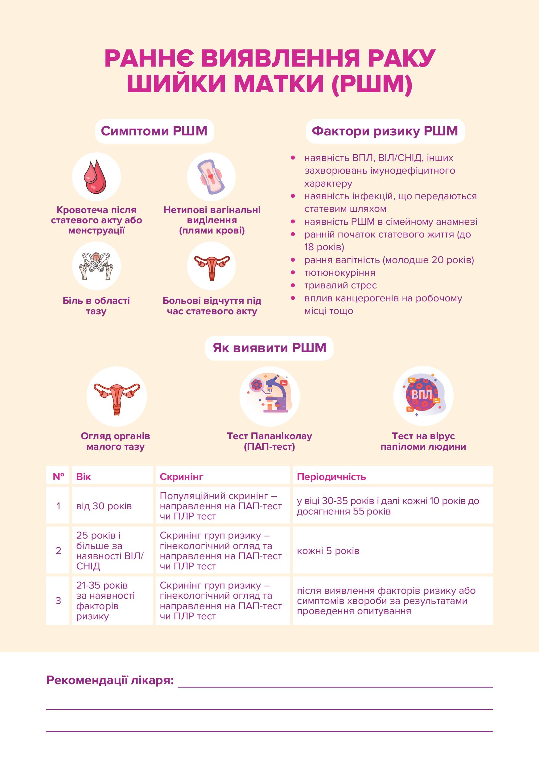 - скринінгові тести на рак шийки матки (Pap-тест) та рак молочної залози;